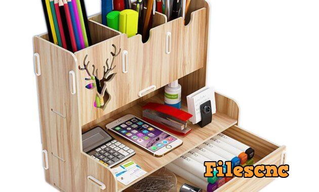 The image presents a wooden desktop organizer designed for efficient storage of stationery and office supplies. The top section has compartments to hold pencils, pens, markers, and rulers, while the middle shelf is ideal for smaller items like calculators, phones, and staplers. A spacious drawer below stores markers, paper clips, and other essentials. Its interlocking construction ensures stability, and the decorative deer cutout adds a stylish touch, making it both practical and visually appealing for home or office use. Laser Cut Desktop Organizer Multifunctional Pen Holder Desktop Stationary Storage Rack For Home Office Free Vector